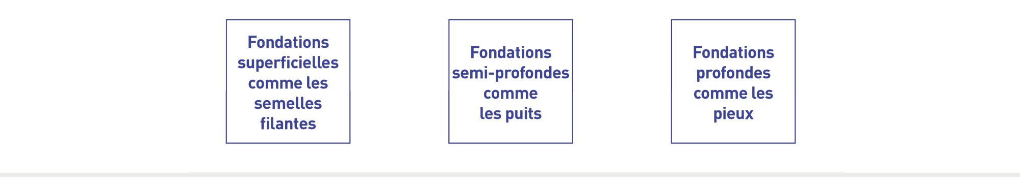 Les fondations forment l’interface entre les ouvrages et le sol d’assise. Il existe plusieurs types de fondation :